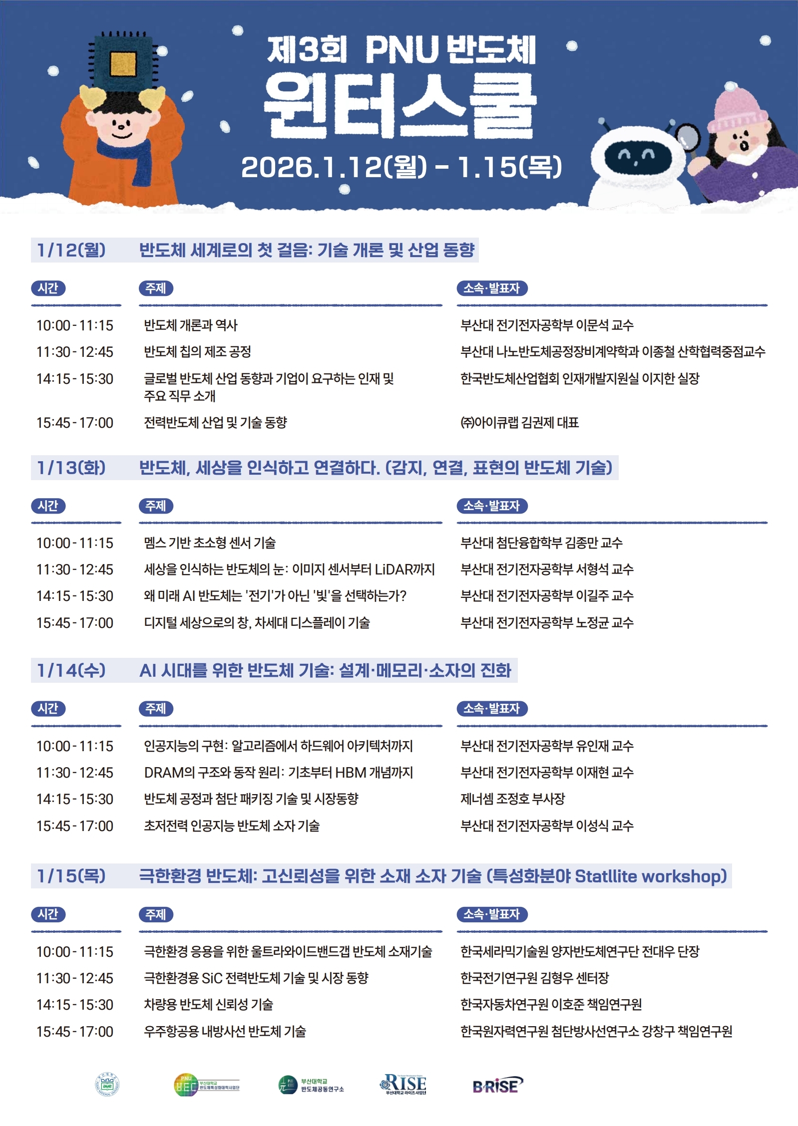 부산대학교 중심 극한환경 전력반도체 분야 차세대 인재양성을 위한 산·학·연 전문가 참여 프로그램 「2025 PNU 반도체 윈터스쿨」을 운영합니다.