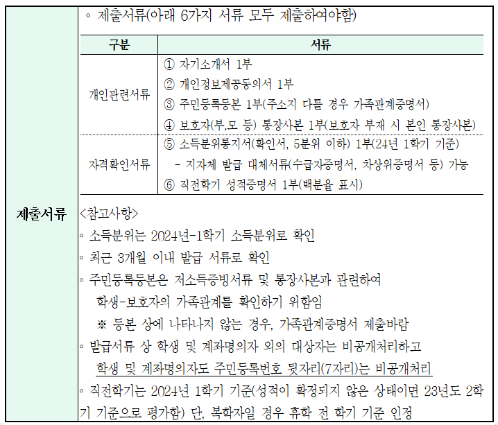 1) 아래 서류 중 ①, ⑤번 및 장학생리스트(엑셀파일)을 제출하여 지원