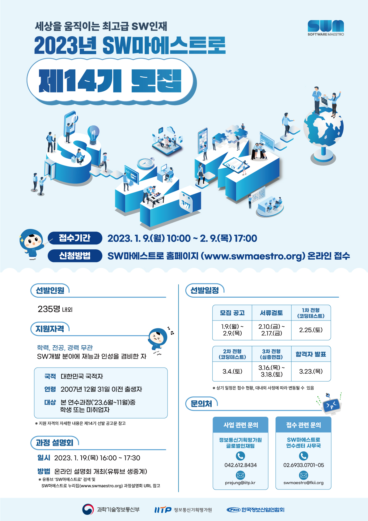 fnctId=bbs,fnctNo=2655 작성일 2023.01.12 수정일 2023.01.12 작성자 안수연 조회수 2750 [한국정보산업연합회] 2023 SW마에스트로 제 14기 모집 첨부파일 첨부파일이(가) 없습니다.