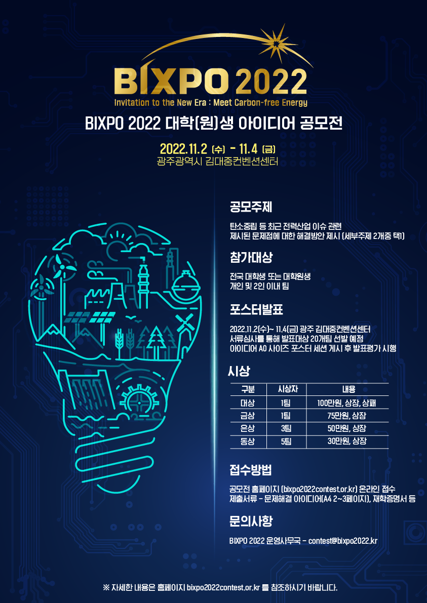 fnctId=bbs,fnctNo=2655 작성일 2022.09.20 수정일 2022.09.20 작성자 안수연 조회수 1751 2022 KEPCO 대학생 국제발명특허대전 안녕하세요! 빅스포 나주 사무국 입니다. 한국전력에서 주최하는 대학생 국제발명특허대전 관련 안내 드립니다.수상자는 한전 채용시 우대 혜택 등이 있으니 학생들의 적극적인 참여 부탁 드립니다. 첨부파일 1. 발명특허공모전 포스터.모집요강.zip