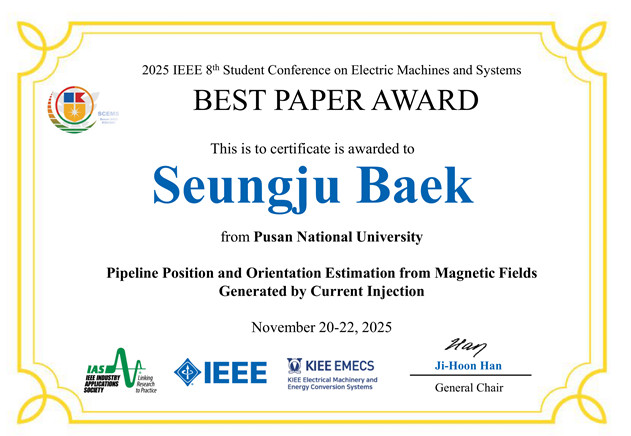 SCEMS 학회에서 백승주 학생은 "Pipeline position and orientation estimation from magnetic fields generated by current injection" 이라는 논문을 통하여 드론을 통해 원격으로 지하 매설 배관 및 결함을 검출하는 기법에 대해 소개하는 발표를 진행하였으며, Best Paper Award에 선정되었다.